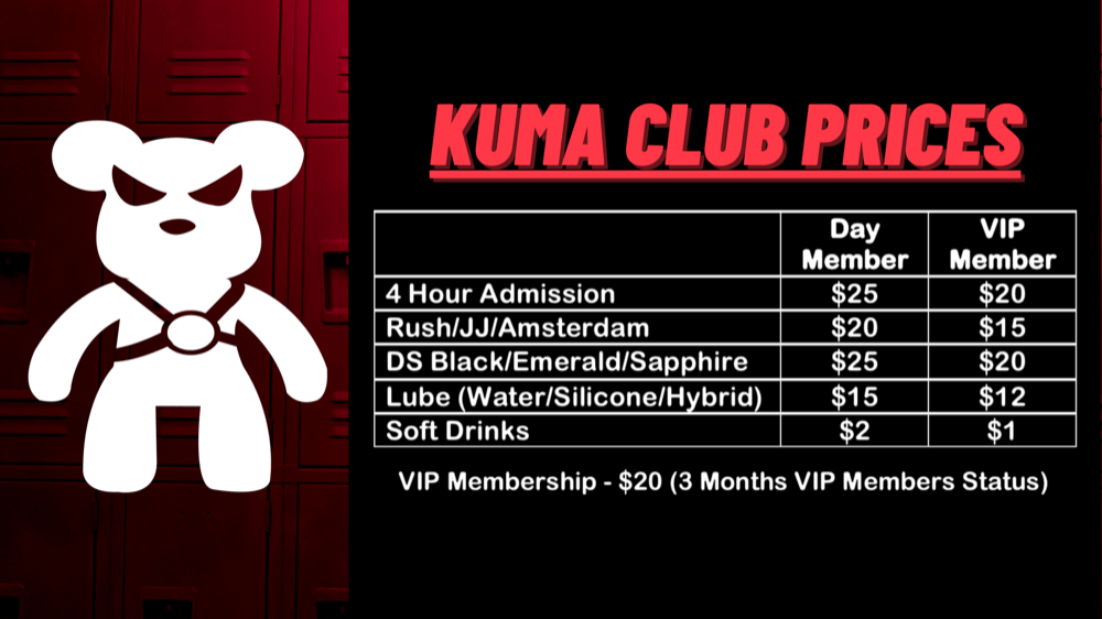 Kuma Health Club is Las Vegas' newest gay owned and operated bathhouse in the heart of Las Vegas' gay district. We are walking distance from Las Vegas' best gay bars/nightclub - FreeZone, Quadz, and Piranha. Kuma Health Club has a steam room, sauna, showers, locker room, lounge area/video room, and more. We also offer complimentary Wi-Fi and filtered water, as well as non-alcoholic beverages, snacks, and various male-geared products and accessories for sale.